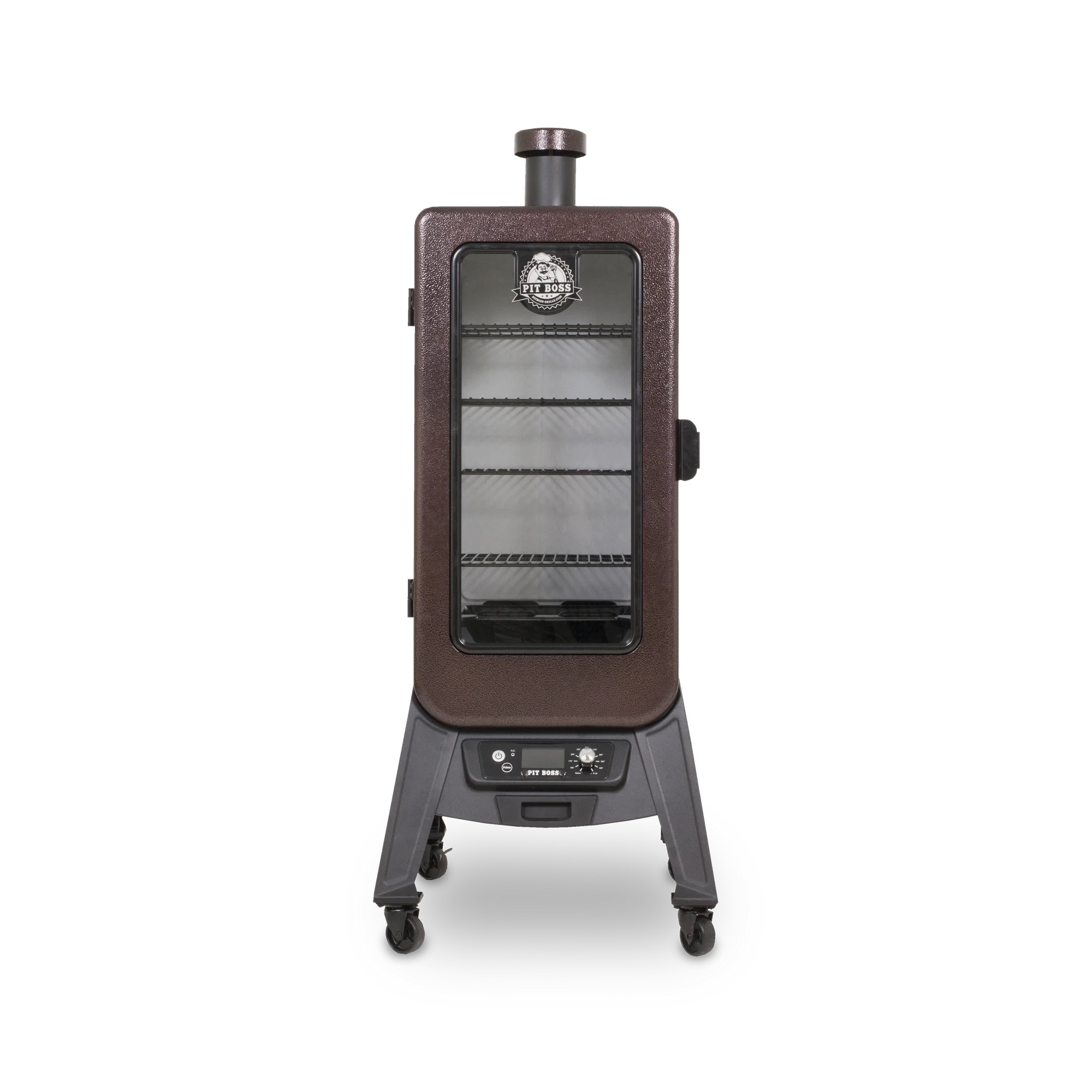 Innovation meets the outdoors with Pit Boss’ all new 3-Series Vertical Pellet Smoker. Never before has smoking been this versatile. The large front window eliminates the need for peek-a-boo cooking and its elevated frame makes transferring your meal from the smoker to the table a breeze. With the PB 3 Series Pellet Smoker there is no need to fret about cooking lengths. Its sleek design is not only unique, it is also functional. The Pit Boss 3 Series Pellet Smoker features 4 locking caster wheels, an easy to read digital controller and a stunning hammer tone copper finish. The multiple position racking system ensures you’ll have enough room to smoke anything your heart (or stomach) desires. Experience how Pit Boss is redefining the smoker industry in your own backyard today!